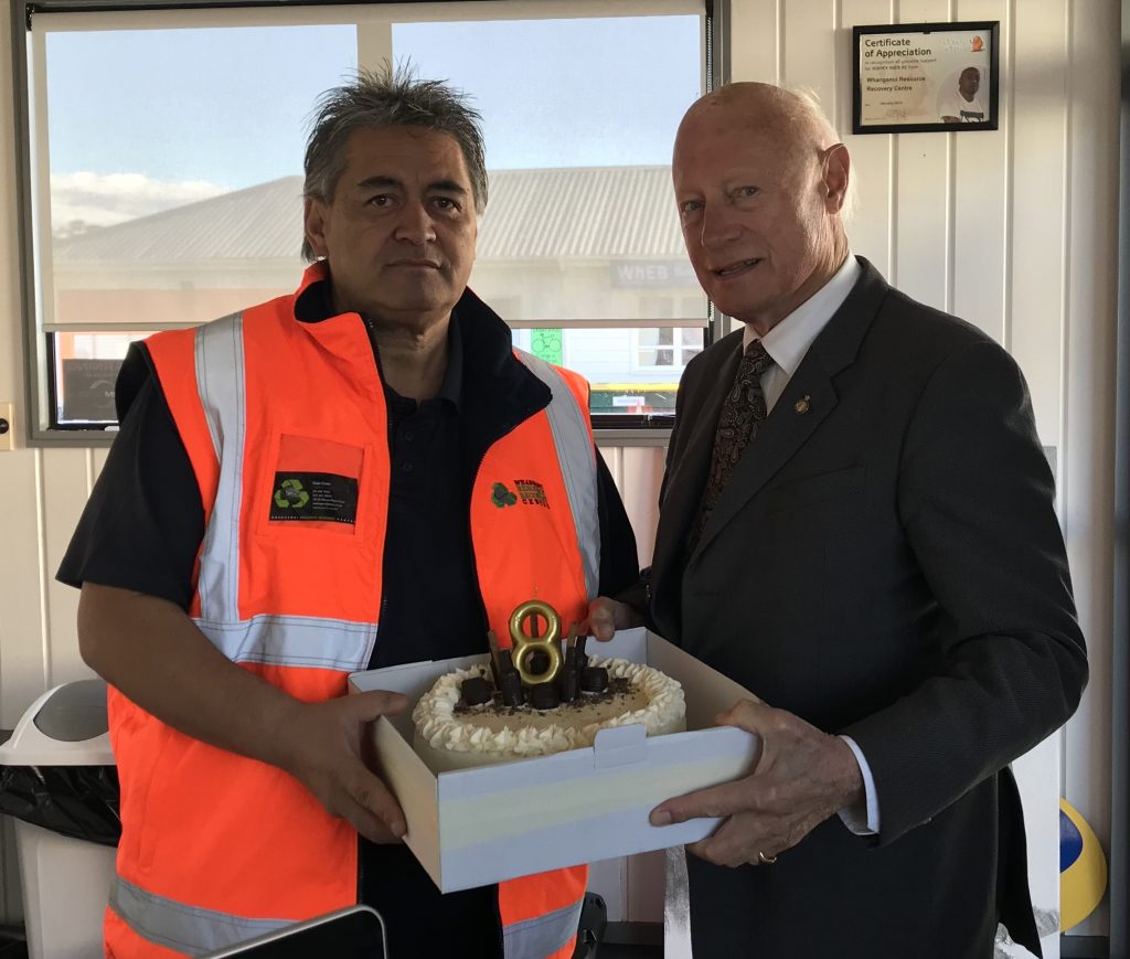 One of our most regular and respected customers Donald Trott gifts a celebration cake to the staff at the Whanganui Resource Recovery Centre. Seen here presenting the 8th anniversary cake to the Centre Manager Dale Cobb. Cobb says, “Donald is one of a group of very unique individuals who visit the site regularly, a real … Continue reading Donald Trott gifts an 8th anniversary cake to WRRC